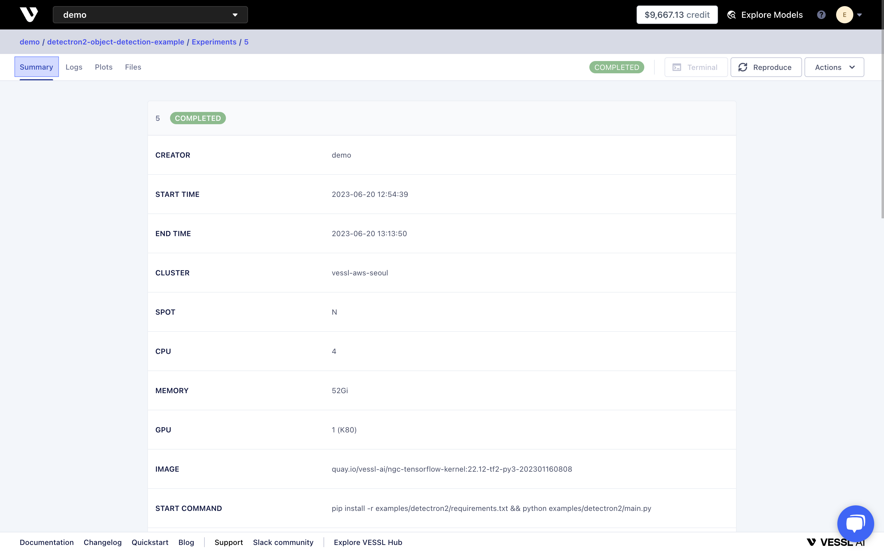Under SUMMARY, you can view all the experiment configurations such as environment variables, quick reproduce via CLI, Docker image, and resource specification.