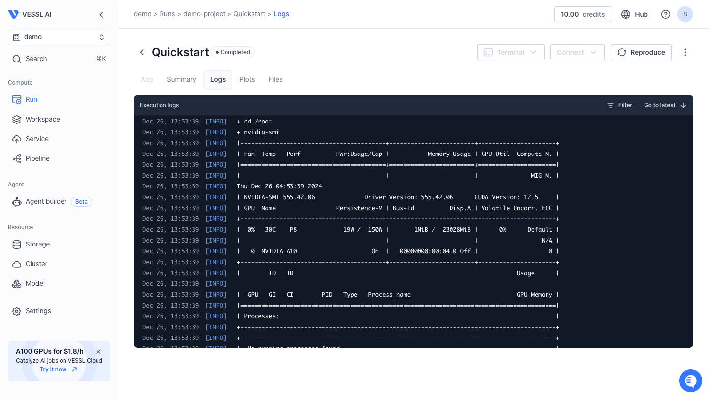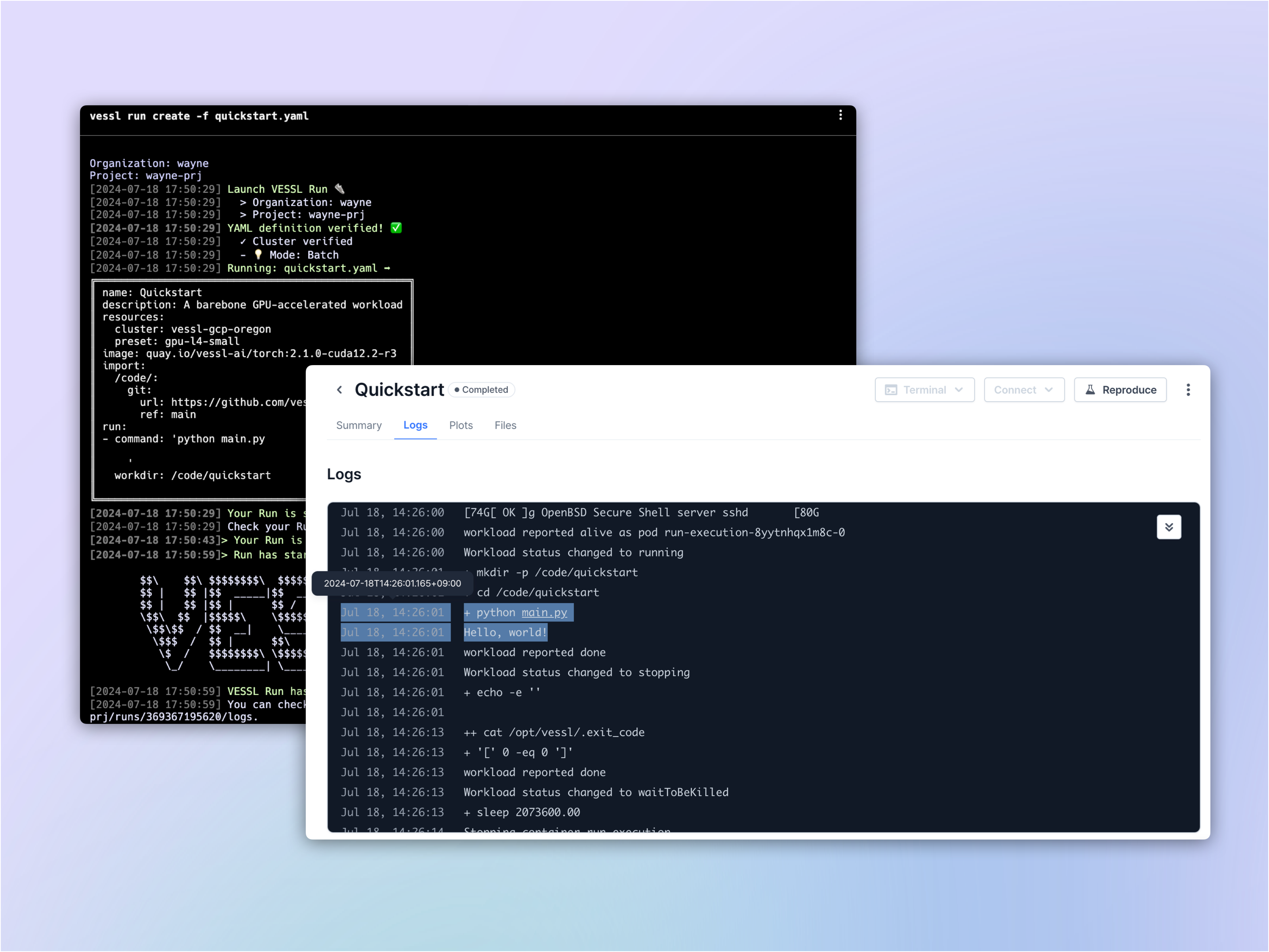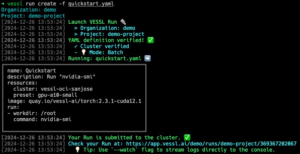 Now that we have a completed YAML, we can run the workload withvessl run.