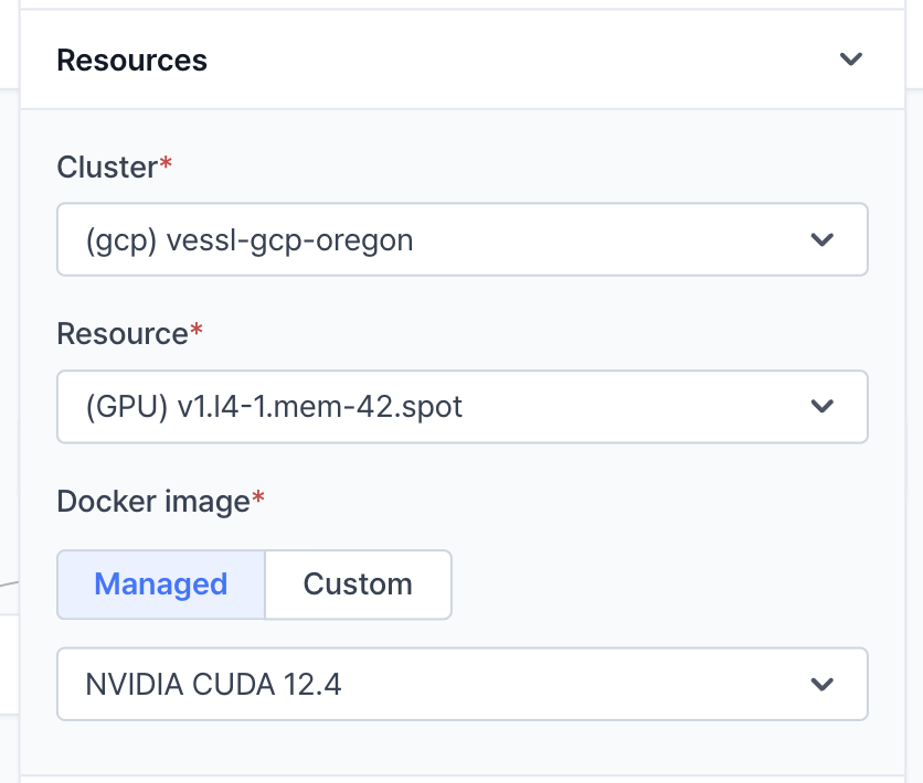 - Cluster: The cluster where the container will be executed. VESSL supports managed-cluster (pre-configured resources) and custom cluster (on-premises, particular cloud configurations).