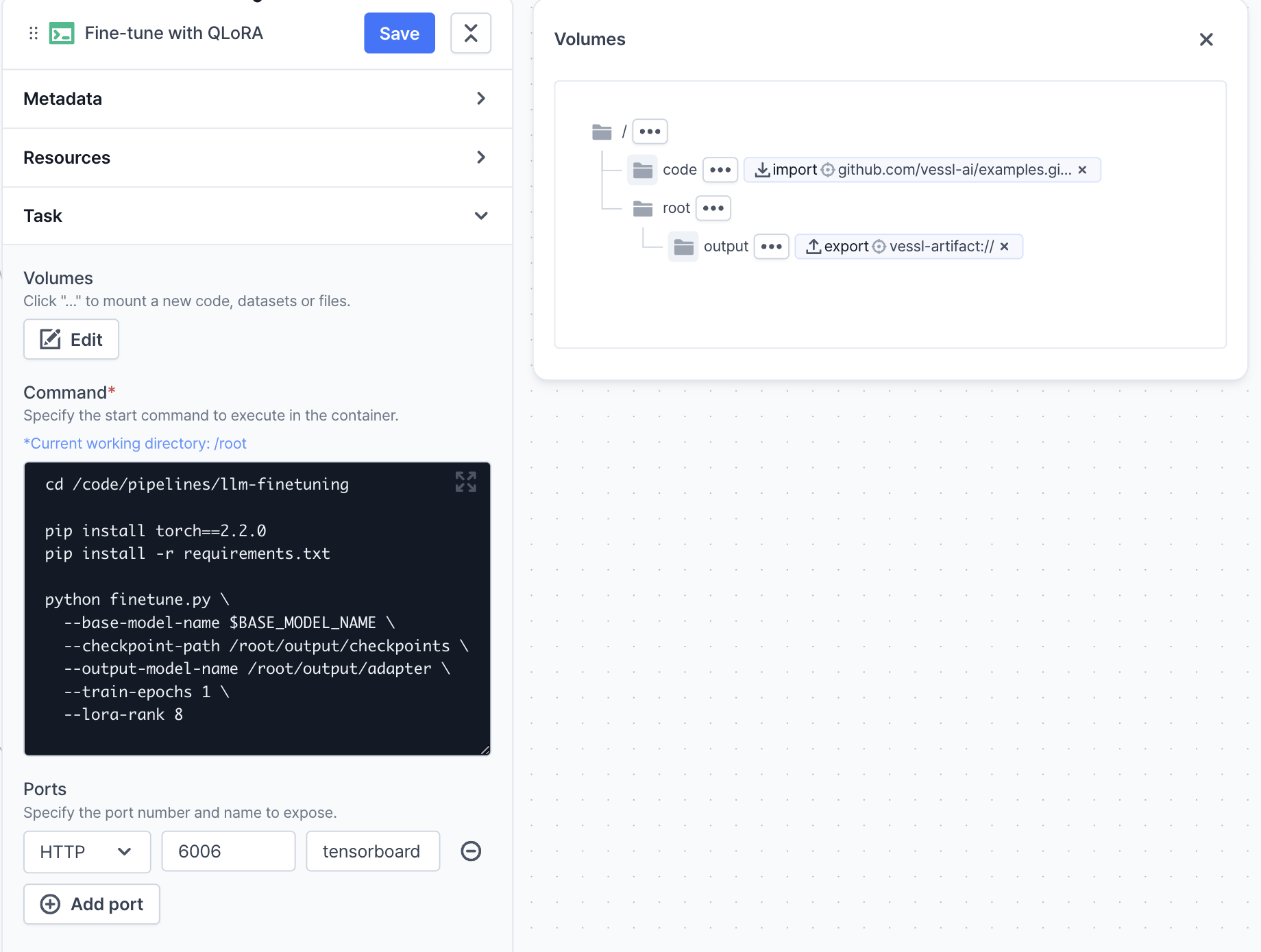 - Volumes: The volume mounts that will be mounted to the container. You can mount the dataset, model, or any other files to the specified path in the container.