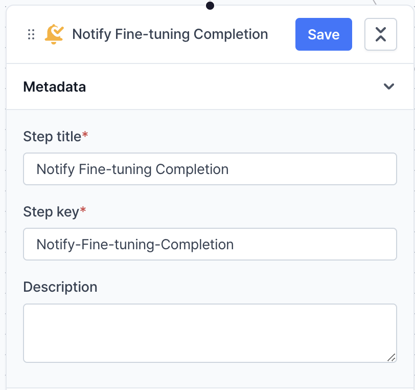 The Notification step sends a notification to a specific email address. You can define the title, message, and email address of the notification.Metadata