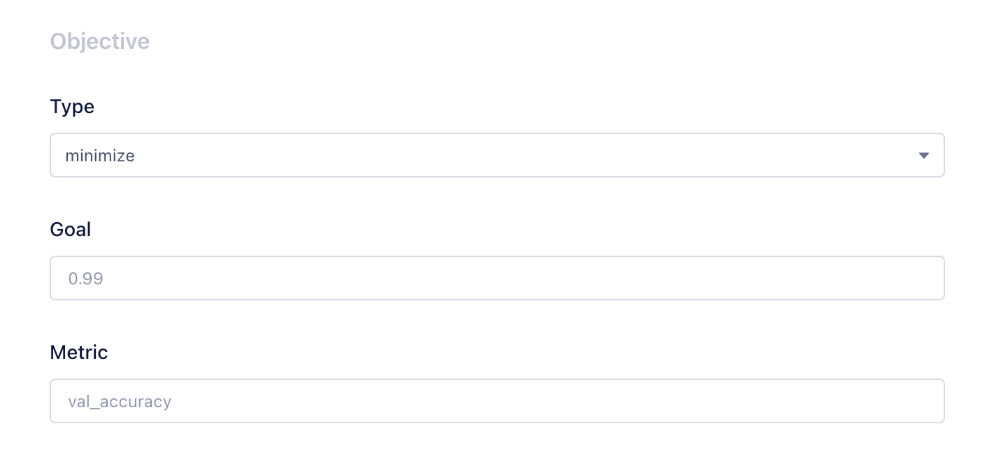 Specify the objective metric that you want to optimize. You can set either to maximize or minimize your target value.- Maximize val_accuracy