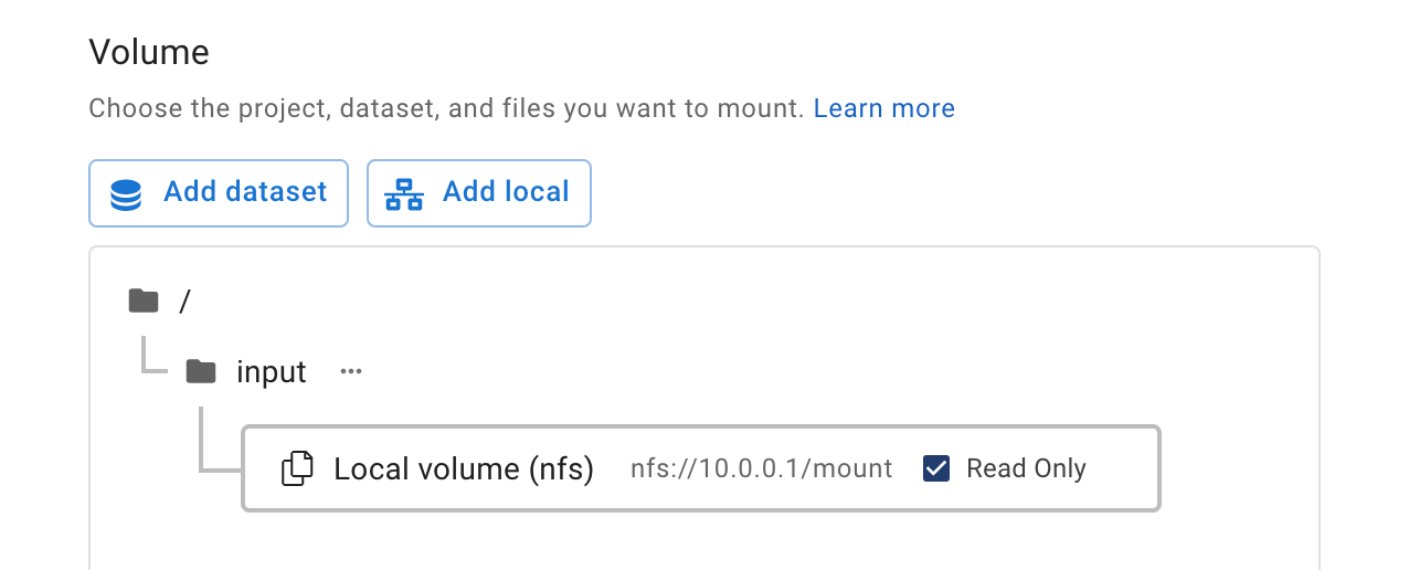 For custom clusters, you can attach NFS/Host machine volumes when creating or editing your workspace.